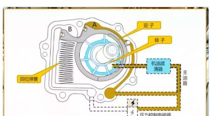在不工作時,機油泵的定子在回位彈簧的作用下,保持與轉子的偏心度最大。如圖5所示。此時的排量也是最大。定子與油泵外壁間有兩個油腔A和B。這兩個油腔就是調節(jié)油泵排量的最關鍵因素了。A腔引入經過濾清器的主油路油壓,而B腔的油壓受到一個電磁閥控制。當發(fā)動機電腦將電磁閥通電打開時,主油路的油壓就會作用在B腔,與A腔的壓力一起將定子向逆時針方向推動。這樣,定子與轉子的偏心度就減小了,排量也就隨之變小。如圖6。
