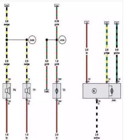 H2. 高音喇叭 H7. 低音喇叭 J400. 刮水器電機(jī)控制單元 T2.2 芯插頭連接 T2c.2 芯插頭連接 T2er.2 芯插頭連接 T4i.4 芯插頭連接 V5. 車窗玻璃清洗泵 A156 . 連接(53c),在儀表板導(dǎo)線束中 B430 . 連接(喇叭),在主導(dǎo)線束中