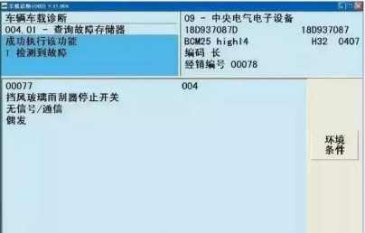 由電路圖可以看出,全新桑塔納的雨刮器和老款的桑塔納控制方法不同,該車雨刮器電機(jī)由BCM控制,可以診斷相應(yīng)故障碼,連接故障診斷儀,讀取故障如圖2 所示。