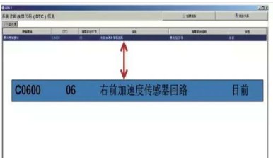 故障診斷:試車確認故障現(xiàn)象存在,GDS檢測到“C0600 06 右前加速傳感器回路”,故障現(xiàn)象是當前,如圖2所示。