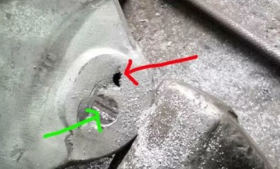 焊完后,一定好打磨平整,否則與膠墊不能緊密貼合,然后鉆一個大孔和一個小孔。綠色箭頭是固定膠墊,紅色箭頭是插定位銷