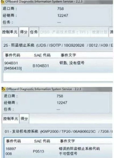 根據底盤號訂購全車鎖,在線匹配后故障排除,此車也可以單獨訂鑰匙解決故障。故障排除后,再次進入25防盜,通過“自診斷”讀取數據流和通過“診斷”讀取的“發(fā)動機防盜鎖止系統(tǒng)”數據流,如圖6所示。