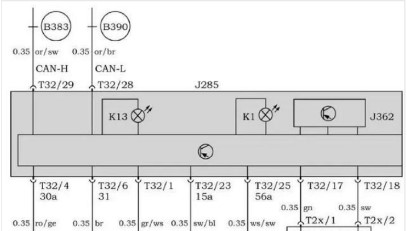 根據診斷儀顯示故障信息和讀取的數據流,并結合維修手冊和電路圖(圖4)進行分析,發(fā)動機故障的原因可能是:鑰匙損壞、點火鑰匙處的讀寫線圈損壞、儀表內防盜控制單元J362損壞或者儀表到讀寫線圈的線路故障。