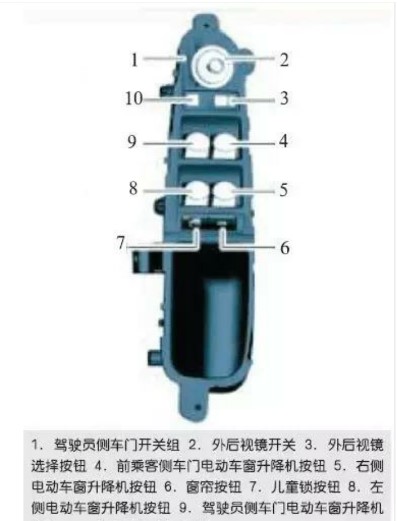 后窗玻璃窗簾按鈕位于駕駛員側(cè)車門開關組內(nèi)(如圖11所示)。