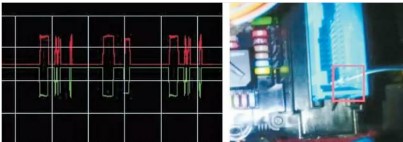 檢查K-CAN2,使用雙通道示波器在CDM的CAN-H與CAN-L測量的波形,如圖8所示中左側(cè),同時測量JBE到CDM的K-CAN2的線路的通斷,如圖8所示中右側(cè),正常。