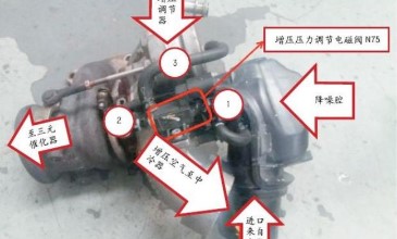 接下來看看渦輪增壓的控制過程,其控制的核心在于對(duì)增壓壓力調(diào)節(jié)電磁閥N75的控制,N75上共有3根軟管(圖1中白色標(biāo)注數(shù)字1、2、3),1是連接自渦輪增壓進(jìn)氣口,和增壓之前的進(jìn)氣相通;2是連接渦輪增壓后的高壓空氣管路,其內(nèi)部壓力和增壓壓力完全一致;3是連接至增壓調(diào)節(jié)器,該調(diào)節(jié)器為一個(gè)膜片盒,當(dāng)發(fā)動(dòng)機(jī)控制單元通過G31監(jiān)測(cè)到增壓壓力過大,則將N75電磁閥通電,2和3被導(dǎo)通,高壓氣體通過3進(jìn)入調(diào)節(jié)器,推動(dòng)連接桿打開,于是發(fā)動(dòng)機(jī)的一部分排氣通過蝸桿推開的旁邊通道直接進(jìn)入三元催化器(如圖2所示),渦輪的轉(zhuǎn)速降低,從而達(dá)到降低增壓空氣的目的。