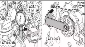 按照維修手冊(cè)(如圖 1 所示)用專用工具 T10170B 配合百分表將 1 缸轉(zhuǎn)至上止點(diǎn)(如圖 2 所示)