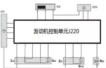 G70. 空氣流量傳感器 G28. 轉(zhuǎn)速傳感器 G294. 制動(dòng)助力器壓力傳感器 G39. 前氧傳感器 G130. 后氧傳感器 N80. 炭罐電磁閥