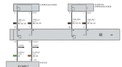 接下來排除油表不準(zhǔn)的故障。該車在燃油箱的左側(cè)和右側(cè)各有一個(gè)燃油油位傳感器,這兩個(gè)滑線變阻式傳感器由接線盒電子裝置(JBE)提供12V電壓,該供電線也是信號(hào)線,反饋當(dāng)前的油位信號(hào)。JBE在讀取這兩個(gè)油位信號(hào)后,將此測量值通過 K-CAN 總線傳遞給組合儀表,從而在組合儀表中顯示燃油箱中當(dāng)前油量(如圖4所示)。