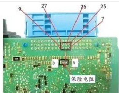 2.無論好的壞的JBE保險(xiǎn)電阻a端與插頭X14271的7號(hào)、8號(hào) 、9號(hào)、 25號(hào)、26號(hào)、27號(hào)端子均相同通。對照電路圖測試,發(fā)現(xiàn)接線盒電子裝置(JBE)的搭鐵線為插頭X14270的23號(hào)、X1472的26號(hào)腳,而保險(xiǎn)電阻的b端子與上述23號(hào)、26號(hào)腳均相通,如圖8、圖9所示。JBE端子說明如表所示。