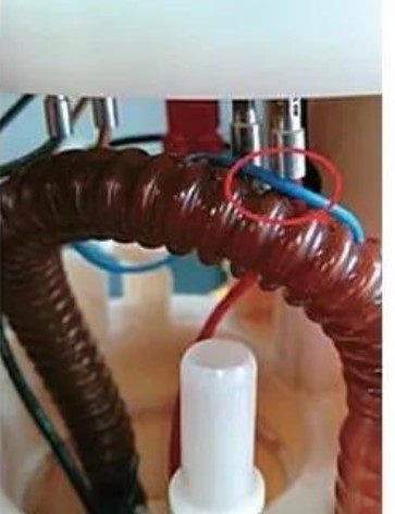 拆下燃油泵檢查,發(fā)現(xiàn)右側(cè)油位傳感器的搭鐵線(藍(lán)色線)有破損處,模擬燃油泵裝于燃油箱中的狀態(tài),發(fā)現(xiàn)該破損處正好與燃油泵供電線正極柱搭接短路,如圖11所示。