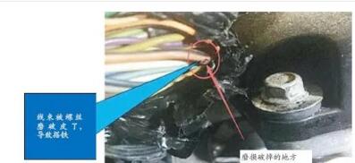 技師再次對(duì)線路進(jìn)行嚴(yán)格的復(fù)查,最終發(fā)現(xiàn)線束與缸體緊固螺絲處有破損燒焦的印痕,如圖5所示。