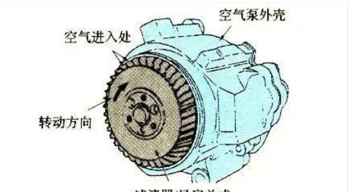 圖上所示為空氣泵的工作過程。由圖可見,由于轉子帶動翼板旋轉,使空氣泵內(nèi)的壓力低于進氣口外的壓力,所以空氣被吸入空氣泵。轉子繼續(xù)帶動翼板旋轉,使空氣被壓縮并流動到排氣口,此時由于排氣口外的壓力比排氣口內(nèi)的小,而且還有.冀板的推動作用,最終使空氣從排氣口排出??諝獗霉ぷ鲿r,這一過程周而復始,將空氣連續(xù)不斷地泵入排氣系統(tǒng)。