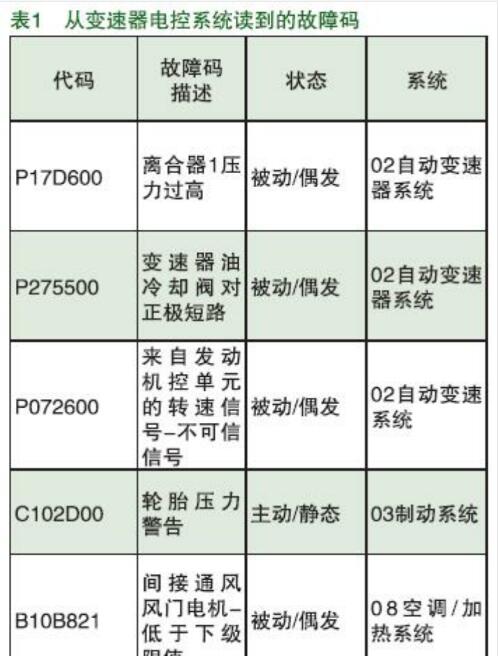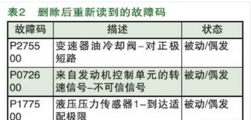 最早該車輛因發(fā)動機不能啟動而通過救援車輛拉至修理廠的,經(jīng)技師檢查發(fā)現(xiàn)變速器電控系統(tǒng)記錄多個故障碼(如表1所示)且有的只能臨時刪除,從發(fā)動機電控系統(tǒng)也讀到了關(guān)于來自變速器系統(tǒng)的請求啟動信息丟失的故障內(nèi)容。