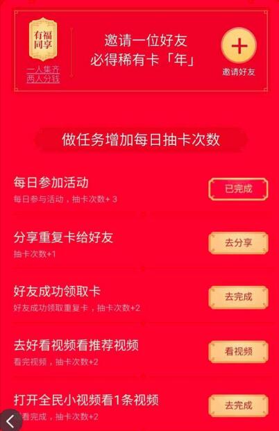 2、如果你覺得每天三次機會不好集齊的話,可以做任務(wù)每日增加抽獎次數(shù)。這里面「年」是稀有卡,但如果你邀請一位好友的話,是肯定可以得到的。