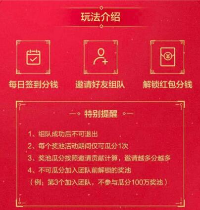 1、點擊立即分錢即可進(jìn)入分錢頁面,每日簽到可以獲得獎金。如果你想獲得更多錢的話,是需要邀請好友解鎖獎池的,最少可以邀請一名好友便可組隊。