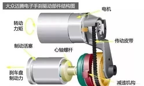 上圖是大眾邁騰的卡鉗式電子手剎驅動部件結構圖。從結構圖中我們可以看到電機、傳動皮帶、減速機構、心軸螺桿以及制動活塞。