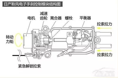 上圖是日產聆風的拉索式電子手剎執(zhí)行機構內部結構圖。從結構圖中我們可以看到電機、減速齒輪組、離合器、螺紋軸、拉索平衡器以及緊急解鎖拉索。